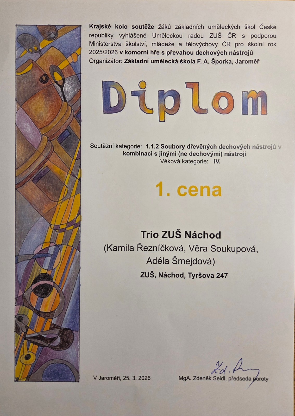 Krajské kolo soutěže v komorní hře s převahou dechových nástrojů se uskutečnilo ve středu 25. března 2026 v prostorách ZUŠ Jaroměř.