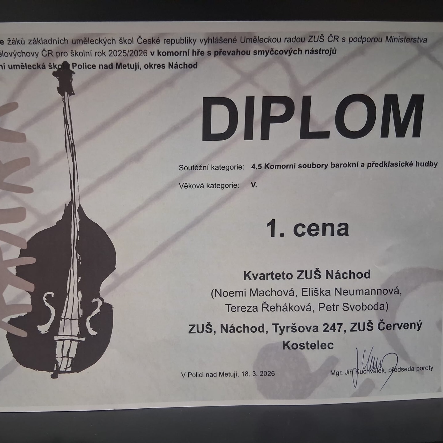 Ve středu 18. března se v Polici nad Metují konalo krajské kolo soutěže ZUŠ v komorní hře se zaměřením na smyčcové nástroje – a naši žáci byli opravdu nepřehlédnutelní.